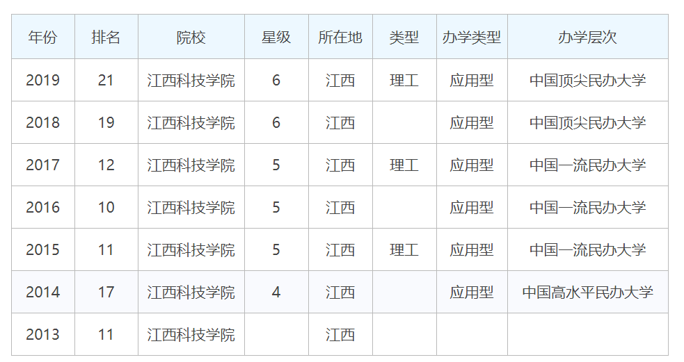 从校友会的大学排名来看,江西科技学院从2015年以来,学校排名有所下滑,2019年在民办大学里位列第21名,办学层次是中国顶尖民办大学,星级被评为六星,学校的办学质量还是得到了社会的认可。